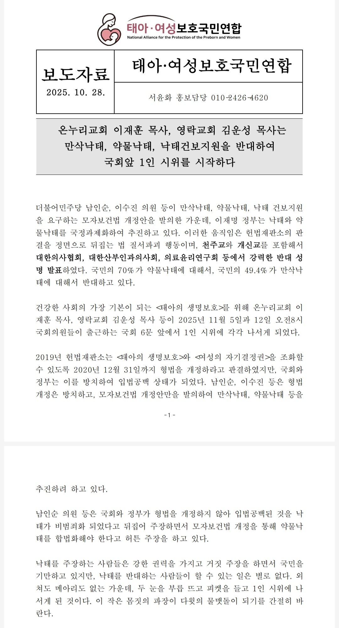 건강한 사회의 가장 기본이 되는 <태아의 생명보호>를 위해 온누리교회 이재훈 목사, 영락교회 김운성 목사 등이 2025년 11월 5일과 12일 오전8시 국회의원들이 출근하는 국회 6문 앞에서 1인 시위에 각각 나서게 되었다.